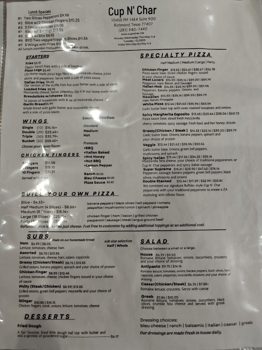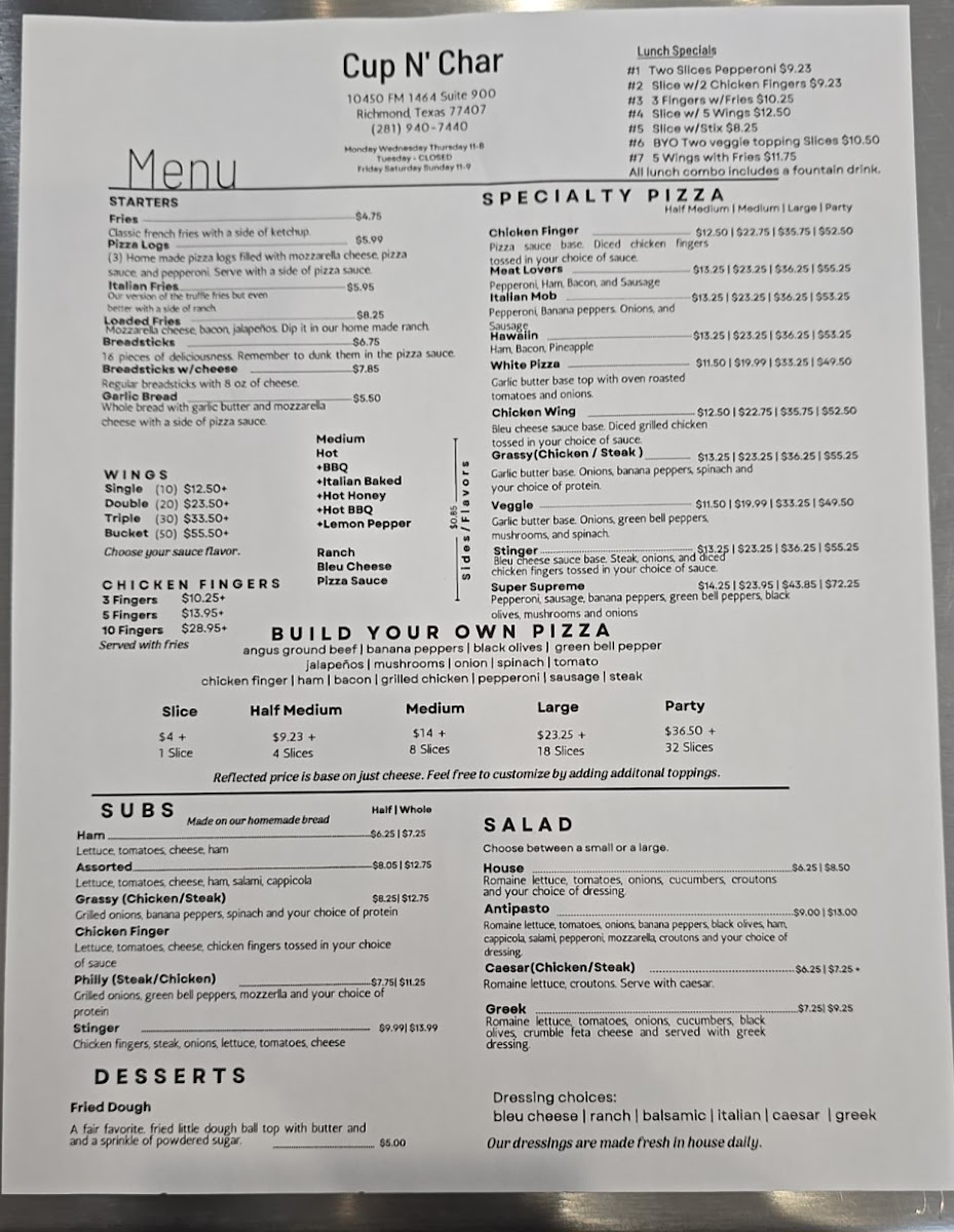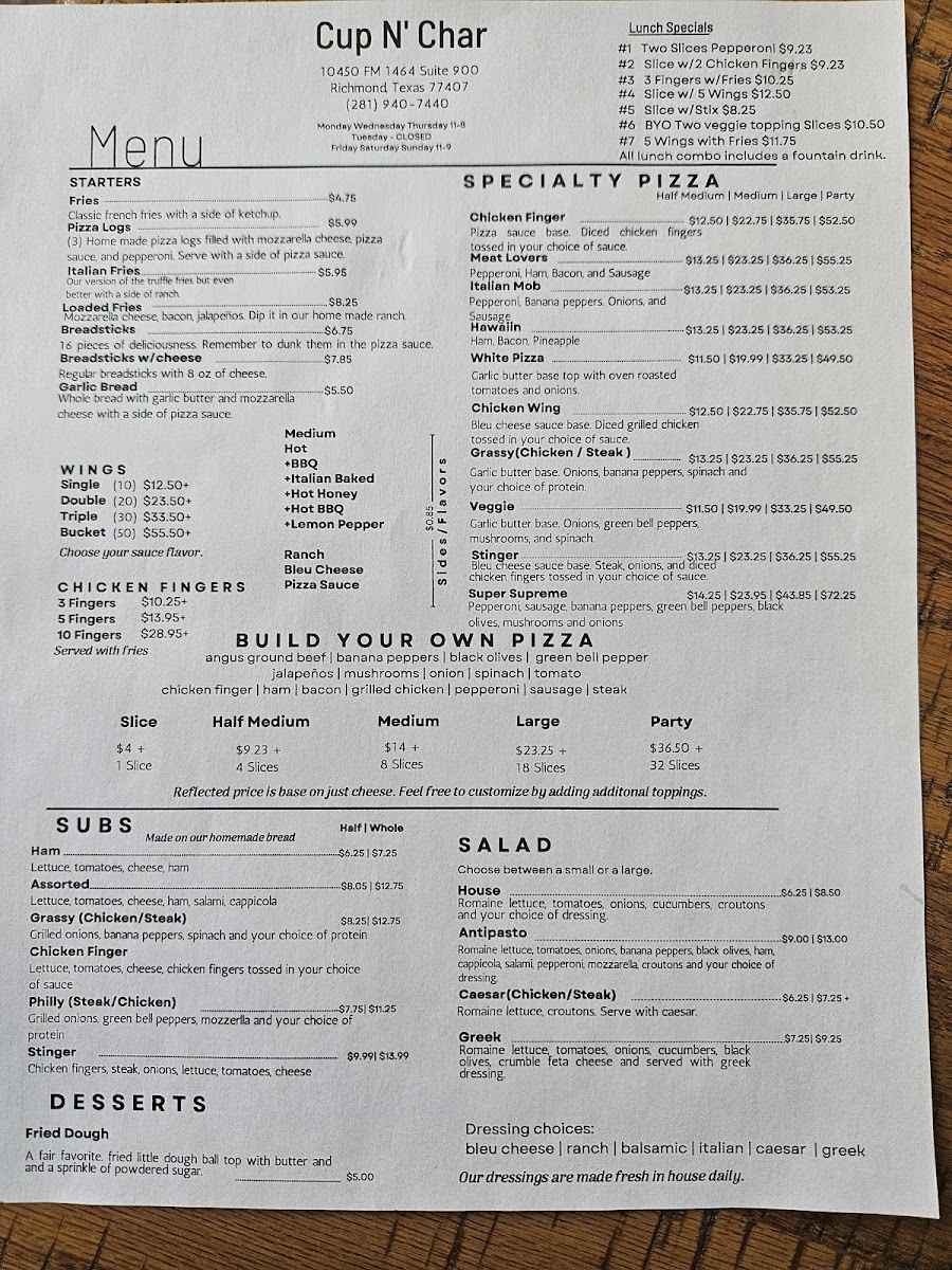 If you find yourself in Richmond, TX, and are craving pizza that's a cut above the rest, look no further than Cup N Char Buffalo NY Pizza. Located at 10450 FM 1464 #900, this pizza haven brings the bold flavors and hearty textures of Buffalo-style pizza right to your plate.