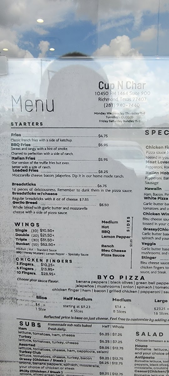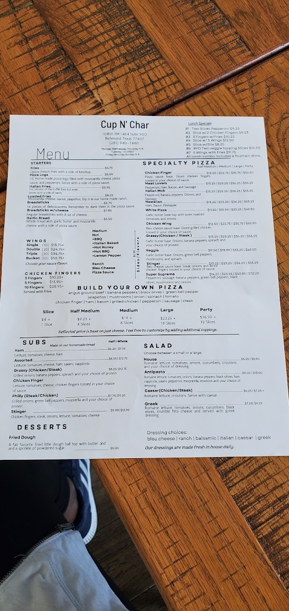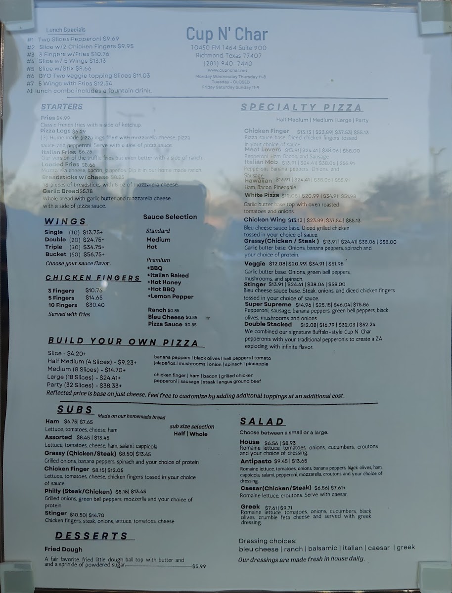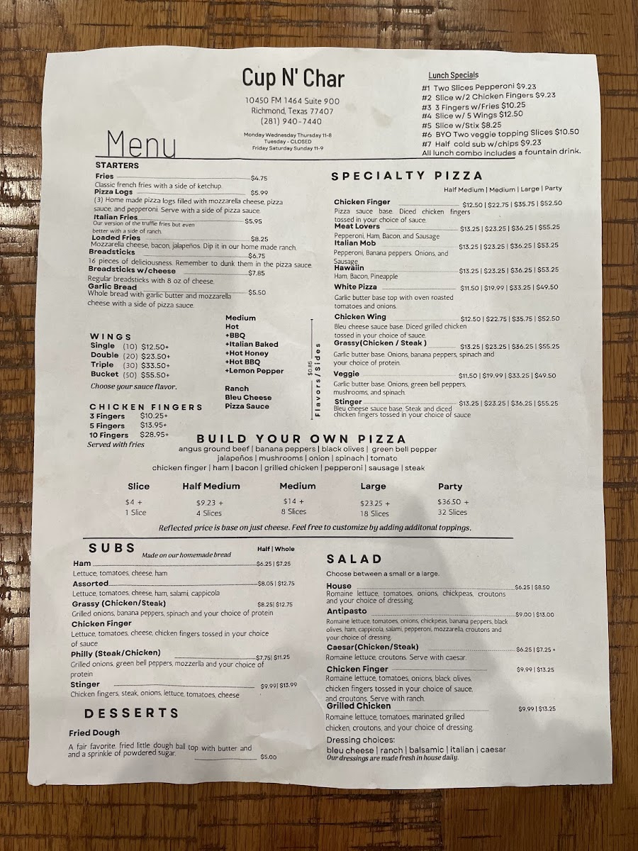 If you find yourself in Richmond, TX, and are craving pizza that's a cut above the rest, look no further than Cup N Char Buffalo NY Pizza. Located at 10450 FM 1464 #900, this pizza haven brings the bold flavors and hearty textures of Buffalo-style pizza right to your plate.